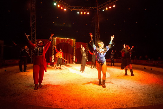 Der große dreigliedrige Artisteneingang aus rotem Samt und dekorativen weiß-roten Säulen nimmt den hinteren Zeltbereich ein. Der wohlbestückte Verkaufswagen der Circusrestauration hat seinen Platz gleichfalls im Spielzelt.