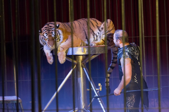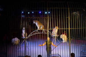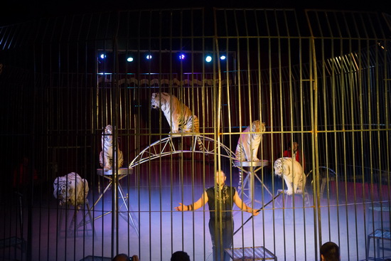 Wie oftmals in französischen Circussen ist der Zentralkäfig schon beim Einlass aufgebaut und nach der Begrüßung des Publikums durch einen jungen „Monsieur Loyal“ namens David, beginnt die Spielfolge mit der Tigerdressur von Ralph Falck. Zwei weiße und drei normalfarbene Tiere präsentieren routiniert eine ansprechende Trickfolge. Pyramide, verschiedene Sprünge, Balkenlauf, Teppich und Hochsitzer am Platz sind die wesentlichen Elemente des Auftritts.
