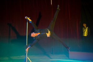 Im artistischen Teil des Programms sehen wir den aus Kuba stammenden Julio Valdez mit zwei Darbietungen. Zunächst arbeitet er eine Reihe kraftvoll ausgeführter Tricks an einem freistehenden, etwa zwei Meter hohen Pole. Als „menschliche Flagge“ bietet er allerlei Absteher, „Handstände“ und Klimmzüge und mit Tricks am rotierenden Requisit findet der Auftritt seinen Abschluss.