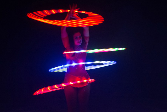 Komplettiert wird die Nummernfolge von Mademoiselle Nadja. Angekündigt als „La femme de al lumière“ lässt sie im abgedunkelten Zelt ihre per LED-Technik leuchtenden Hula Hoop Ringe kreisen. Die Reifen wechseln in stetem Rhythmus die Farben und zaubern surreale Lichtmuster in die Dunkelheit.