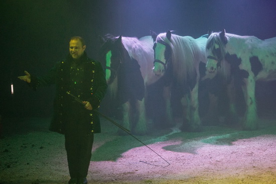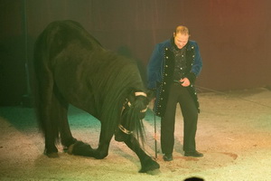 Wenig später präsentiert Monsieur Falck die Cavallerie des Hauses. Drei schwarz-weiß gescheckte Pferde traben ihre Runden in den Manegensand. Flott und fehlerfrei reihen sich die Figuren aneinander. Als Da Capo zeigt ein Friesenhengst sein erlerntes Können.