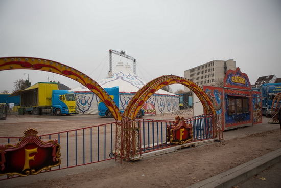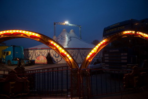 Auf einem innenstadtnahen Parkplatz war der Circus aufgebaut. Ein hohes Zwei-Masten Chapiteau, das von zwei spitzen runden Kuppeln gekrönt wird, ist die Spielstätte des Unternehmens. Seine weiße Plane ist mit großflächigen markanten blau-roten Ornamenten geschmückt.
