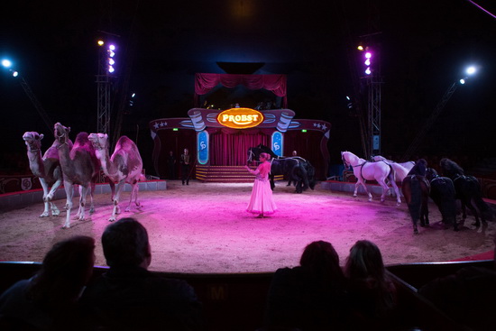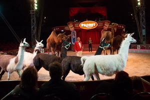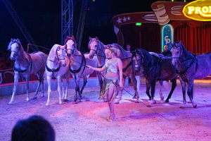Mit einer interessanten Dressurkombination eröffnet Stefanie Probst die Nummernfolge. Drei gescheckte Dromedare, je zwei weiße Araber und Friesen sowie drei Dartmoore Ponys zeigen vielseitige Lauffiguren. Unter der gekonnten Peitschenführung der versierten Dresseurin erfolgen die Touren in schwungvollem Ablauf. Achterlauf eines Shetland Ponys um die Friesen und ein schöner Steiger beenden als Da Capo den gelungenen Auftritt.