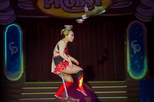 Die chinesische Artistin He Yuan bietet eine erstklassige Balance auf dem Hochrad. Sie steuert das Rad mit einem Fuß auf dem Pedal und kickt mit dem anderen bis zu vier Metallschälchen zu gleich hoch und fängt sie sicher in einem frei auf ihrem Kopf stehenden Gefäß. Dann geht es mit dem Hochrad, Longen gesichert, auf eine große Kugel, die gegen seitliches wegrollen gesichert in einer geformten Mappe liegt. Nun werden wieder Gegenstände hochgekickt und sicher auf dem Kopf gefangen.