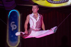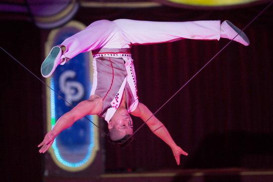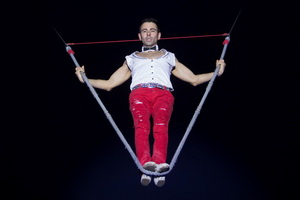 Der kubanische Artist Utnier Aquino Hernandez gehört seit einigen Jahren zum Ensemble des Circus Probst und ist in dieser Spielzeit mit zwei Darbietungen im Programm vertreten. Zunächst sehen wir seinen dynamischen Auftritt am Schwungseil. Ein längeres, teilbares Seil ermöglicht einen originellen, mit einigen Tricks gestalteten Aufgang. Eine Reihe effektvoller Abfaller werden im vollen Schwung ausgeführt und sorgen für Nervenkitzel auf den Rängen.
