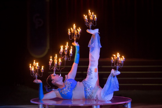 Anmutig führt „Schlangenmädchen“ Wang Lin ihre Kunst vor. Nach einigen einleitenden Kontorsionstricks, mit denen sie ihre enorme Beweglichkeit darstellt, balanciert sie fünf Leuchter mit brennenden Kerzen auf Händen, Füßen und Mundstab während sie ihren Körper in extremer Weise biegt.