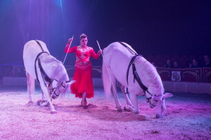 Drei Tier-Darbietungen aus dem umfangreichen Repertoire der Familie Probst sind in der Show zu erleben. Zunächst präsentiert Stephanie Probst gekonnt und elegant fünf schneeweiße Araberhengste in einer harmonischen Freiheitsdressur. Souverän agierend lässt die versierte Tierlehrerin die verschiedenen Figuren ablaufen. Mit einer Reihe erstklassig ausgeführter Da Capo Steiger klingt der Auftritt in gelungener Weise aus.