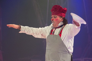 Clown Rudi Brukson ist bereits während des Einlasses mit ersten Späßchen präsent und stimmt das Publikum mit einem kurzen Applaustest auf das Kommende ein. In seiner ersten Reprise jongliert er, im Koch-Outfit mit allerlei Küchenutensilien. Ein hoch in die Kuppel geworfenes Hühnerei soll auf einem Teller landen – soweit jedenfalls der Plan. Wenig später ficht er einen heroischen Kampf gegen einen überdimensionalen Wurm, der in einem ebensolchen Apfel steckt. Schließlich entpuppt sich der Wurm – Ehefrau Irina übernimmt den Part – als bezaubernder Schmetterling. Unfassbare Magie beherrscht eine weitere Szene, in der der Clown ein Goldfischglas samt Inhalt auf wundersame Weise verschwinden lässt. In der umfangreichsten Reprise requiriert der Clown flugs fünf Mitspieler. Vier von ihnen erhalten Glöckchen, während dem fünften, mit zwei Becken ausgestattet, eine besondere Rolle zukommt.