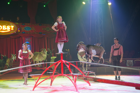 Wenig später sehen wir die Juniorchefin zusammen mit ihrem Ehemann Sergui Munteanu und Töchterchen Celina eine muntere Ziegen-Revue präsentieren. Vielfältige Tricks werden von den acht Tieren unterschiedlicher Rassen geboten und die zwei gescheckte Esel, ihre Fellfarben korrespondieren hervorragend mit denen der Ziegen, sind gleichfalls in die Darbietung integriert.