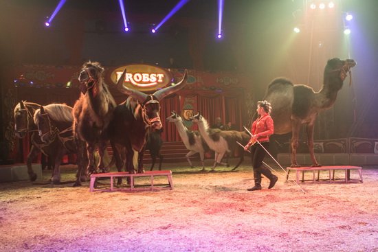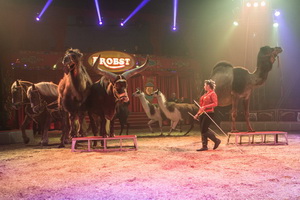 Zu unserer Überraschung wird der Exotenzug des Hauses nicht mehr als Pausennummer präsentiert, wie seit vielen Jahren Tradition war, sondern ist nun zu Beginn des zweiten Programmteil zu sehen. Zu unserem Bedauern steht Direktor Reinhard Probst an diesem Abend nicht im roten Ring. Die Exoten laufen nun unter der Peitschenführung von Juniorchefin Stephanie Probst ihre Figuren.
