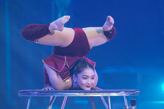 Zunächst erleben wir Suldbaatar Adilbish mit seiner veritablen Kraftjonglage. Zu dem kehligen Klang traditionellen Liedguts seiner Heimat jongliert der kraftvolle junge Mann mit mächtigen metallenen Kugeln und wirbelt einen Baumstamm um seinen Körper. Schließlich trägt er das Gewicht mehrerer Truppenmitglieder nur mit seinen Zähnen.