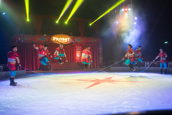 In einem weiteren Auftritt demonstriert die Truppe ihr Können mit Sprungseilen. In vielerlei Varianten und wechselnden Konstellationen werden die Seile ein ums andere Mal überquert. Die sehr sicher ausgeführten Aktionen münden in Sprünge im 3-Mann-Hoch.