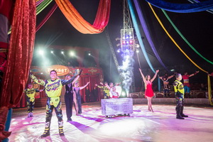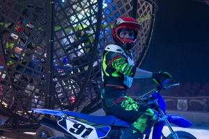 Die Final-Darbietung sieht die „Torres Truppe“ in Aktion. Die verwegenen Motorradartisten aus Kolumbien jagen in halsbrecherischer Weise durch den „Globe of Death“. Bis zu vier Fahrer sind zeitgleich in der nur vier Meter Durchmesser messenden Stahlgitterkugel auf kreuzenden Bahnen unterwegs.