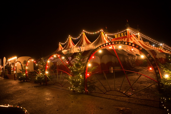 Auf dem Schützenplatz, dem Festplatz der Stadt, war der schmucke Circus perfekt aufgebaut. Unzählige Lichter funkeln in der Dunkelheit am Chapiteau und der prächtigen Fassade. Die Lichter der Weihnachtsbäume glitzern mit den Bögen des Frontzaunes um die Wette. Den zentralen Platz in der Front nimmt ein Tonnendachwagen mit dem Kassenschalter ein.