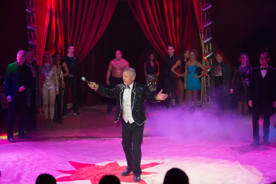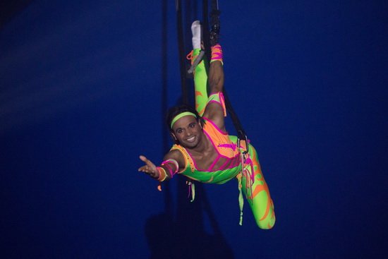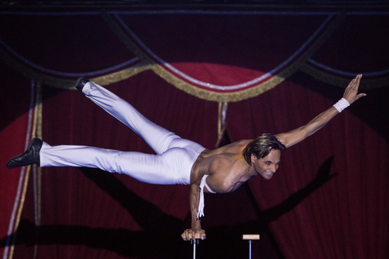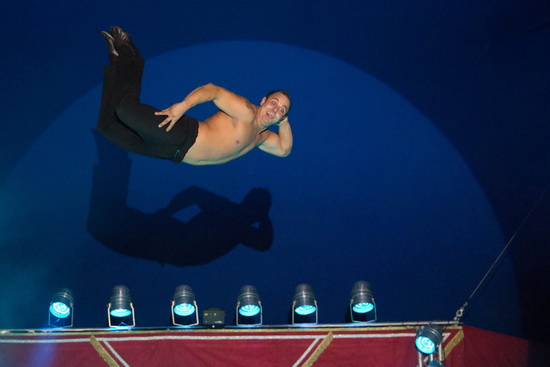 Nach dem Opening durch das hauseigene Ballett und der Begrüßung durch Direktor Hardy Scholl, der in der Show in sehr angenehmer Weise die Rolle des Manegensprechers übernimmt, arbeitet David Hammarberg eine interessante Luftnummer. Er kombiniert Schwungtrapez und Bungee, wobei am Trapez verschiedene Balancen und Halteposen gezeigt werden. Die Bungeebänder erlauben weite Flüge durch den gesamten Luftraum der Kuppel.