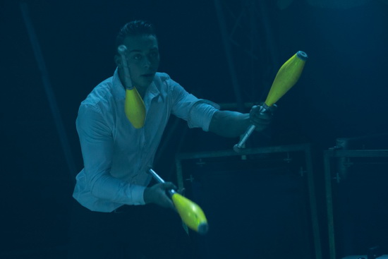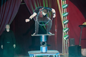 Im abgedunkelten Zelt arbeitet Jongleur Alfred Scholl die ersten Routinen mit von innen beleuchteten Bällen. Temporeich und versiert geht der junge Mann zu Werke und beweist mit bis zu fünf Keulen und sieben Ringen Vielseitigkeit und Können. Besonders effektvoll sind die abschließenden Muster mit Fackeln.