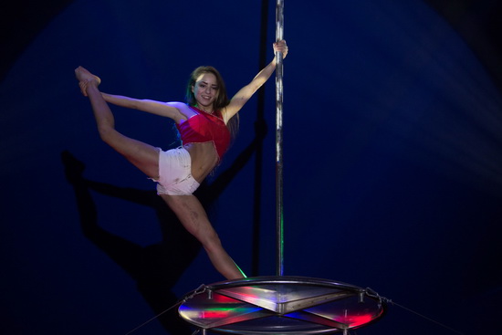 Seine Schwester Talina bietet einen fulminanten Pole Dance in luftiger Höhe. Ihr Requisit schwebt etliche Meter über der Manege auf einer dort installierten gläsernen Plattform. Die starke und mitreißend performte Trickfolge erhält durch die außergewöhnliche Perspektive zusätzlichen Drive.