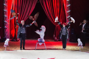Gerd und Marietta Koch präsentieren zwei Kakadus, zwei Aras und drei weiße Pudel in einer vielseitigen Dressurfolge. Die Hunde zeigen sich als talentierte Springer und der größte dient einem Ara als Reittier. Die Papageien rollen einen Teppich aus und wieder ein, laufen auf einem Ball, nutzen eine Rutsche, wechseln auf Kommando die Position auf zwei Spiegelkugeln. Sie fliegen durch einen Ring und durchfliegen einen mit Papier geschlossenen Reifen. Abschließend fliegen die Aras ihre Runden, dicht über den Köpfen der Besucher, durch das Zelt.