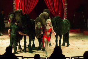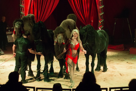 In einem abwechslungsreichen Ablauf präsentiert Marylin Zinnecker zwei Kamele zusammen mit zwei Friesenhengsten. Vielseitige Lauffiguren lässt die sympathische Tierlehrerin souverän ausführen. Im zweiten Teil des Programms sehen wir sie auf einem eleganten weißen Hengst eine gekonnte Hohe Schule reiten. Zu Irish Folk Klängen wird der Auftritt tänzerisch von Miss Kimberly begleitet. Miss Kimberly ist es vorbehalten gleich im Anschluss sieben schwarze Ponys zu ihren erlernten Lauffiguren anzuleiten.
