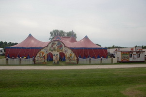 Nostalgisches Ambiente herrscht auch in den Zeltanlagen vor. Zahlreiche, aus Holz gefertigte und in den Circusfarben lackierte, Verkaufsstände sind in hervorragender Weise professionell mit stimmigen Motiven, im gleichen Stil wie die Fassade und Plakatmotive, bemalt. Zahlreiche Dekorationselemente und die stimmungsvolle Beleuchtung mit Glühbirnen verleihen dem Zelt seine einmalige, unverwechselbare Atmosphäre. Zahlreiche Biertisch-Garnituren zwischen den Zelten laden an diesem heißen Sommerabend zum Aufenthalt.