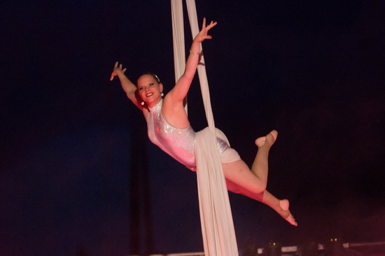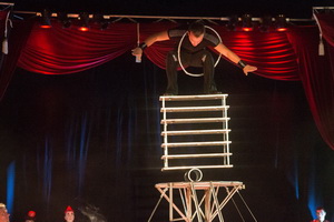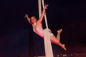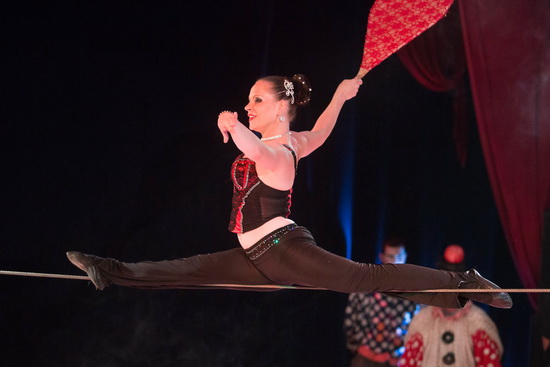 Nahtlos schließt sich die Seiltanz-Darbietung von Reni Toth an. Routiniert werden die verschiedenen Schrittfolgen und unterschiedliche Sprünge ausgeführt. Spagat und andere Balancefiguren ergänzen die Trickfolge. Im zweiten Programmteil erleben wir die versierte Artistin an den Strapatentüchern. Zahlreiche kraftvolle Haltetricks und riskante Abfaller werden in rascher Abfolge gearbeitet.