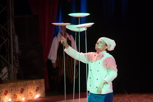 Jindrich Reichert ist gleichfalls zwei Mal in der Manege präsent. Zunächst sehen wir ihn in Kochuniform und als Clown geschminkt Teller drehen. Nach den üblichen Turbulenzen rotieren schließlich fünfzehn Teller auf ihren Stäben.
