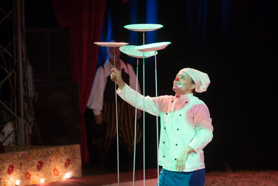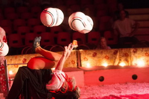 Eliane Baranton präsentiert ihre erstklassige Antipoden-Nummer nun in der Manege des Circus Renaissance. Im Gipsy-Look arbeitet die erfahrene Artistin zunächst mit bis zu fünf großen weißen Bällen. Mit enormer Sicherheit werden die beiden Tonnen empor gekickt, wieder aufgefangen und auf vielfältige Art mit den Füßen manipuliert. Die abschließenden Routinen mit einem großen Tisch erfolgen mit großer Souveränität. Auch das extrem schnelle drehen der Keulen wird sicher demonstriert und mit einer effektvollen Fackeljonglage klingt die Nummer aus.