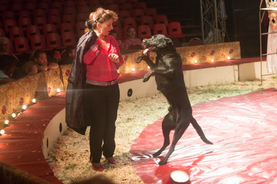Eine ausgelassen umher tollende Hundemeute bevölkert im zweiten Auftritt die Manege. Fünf Hunde haben ihre Plätze in aufgeklappten Reisekoffern und ein sechster gelangt aus der Umhängetasche der als „Tussy“ gestylten Tierlehrerin in die Manege. Die Trickfolge ist in eine kleine Story eingebettet, indem die Vierbeiner ihre Trainerin vor ihrem Ankleidekabinett „stören“, ihr Hut und Federboa abjagen und sie von hinten anspringen. Turbulent werden Sprünge und Hinterbeinläufe – auch rückwärts – ausgeführt. Zum Abschluss der Nummer zeigen sich die größeren Hunde als begeisterte Jockeys eines Ponys.
