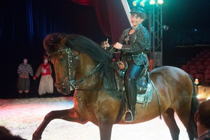 Mit drei anspruchsvoll und ausgefallen gestalteten Darbietungen tritt Beatrix Spindler vor ihr Publikum. Zunächst präsentiert sie im Look einer venezianischen Prinzessin einen Fünfer-Zug Freiheitspferde. Die Hengste tragen über ihren Halftern goldfarbene Masken und schmale lange goldene Schabracken ergänzen die royalblauen Puschel. Temperamentvoll dirigiert die erfahrene Dresseurin die Pferde zu ihren zahlreichen Lauffiguren. Verschiedene Steiger komplettieren die Darbietung und mit einem Seil springenden Hengst erreicht die Nummer ihren Höhepunkt.