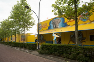 Die Ställe für die drei indischen Elefanten des Circus sowie für die zahlreichen Pferde und Exoten nehmen zusammen mit den Wohnwagen den vorhandenen Raum ein.