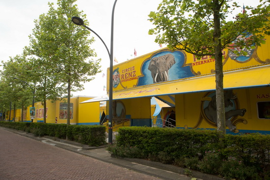 Der vorhandene Platz reicht kaum aus, den großen Circus auf zu nehmen. Der Auflieger mit der großen, mit zahlreichen Circusmotiven bemalten, Fassade ist dicht an den Bäumen die den Platz säumen aufgestellt. Die breite Treppe die zu den integrierten Kassenschaltern führt findet Ergänzung in einer flachen Rampe für gehbehinderte Besucher. Weitere dicht an dicht stehende Auflieger ergänzen die Front. Zentral auf dem Platz wurde das große, hohe Chapiteau moderner Formgebung errichtet, dessen Mastspitzen von Leuchtelementen gekrönt sind. Gelb und hellblau sind die Hausfarben des Circus Renz International, die durchgängig auf Zeltanlagen und Fahrzeugen zu finden sind. Der in einem kräftigen rot ausgeführte Namenszug leuchtet von den Fahrzeugen entgegen. Viele Sattelauflieger, einige mussten auf angrenzenden Grünflächen abgestellt werden, bilden den umfangreichen Fuhrpark des Circus. Die modernen Zugmaschinen sind mit einem auffälligen Dekor versehen und mit vielen verchromten Anbauteilen herausgeputzt. Auf Grund der Platzverhältnisse konnte das geräumige Vorzelt nicht aufgestellt werden, so dass der große Sattelauflieger der Circusrestauration im Freien direkt neben dem Chapiteau stand.