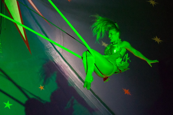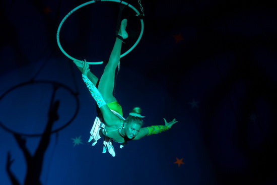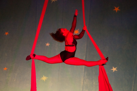 Miss Georgina arbeitet eine furiose Darbietung an den Tuchstrapaten. Kraftvoll erfolgen die Tricks und mit weiten Flügen füllt die versierte Artistin die weite Kuppel des Chapiteau. Elegante Halteposen und riskante Abfaller folgen in raschem Wechsel aufeinander und prägen die Nummer.