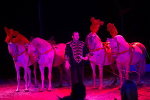 Franz Renz jun. präsentiert eine eindrucksvolle Freiheitsdressur mit vier weißen Arabern. Diese beherrschen ein umfangreiches Repertoire variantenreicher Lauffiguren. In Perfektion folgen Pirouetten, Volten und Gegenläufe aufeinander. Eine Reihe verschiedener, erstklassig ausgeführter Da Capo Steiger bilden den Höhepunkt der Darbietung.