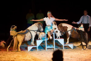 Im weiteren Verlauf der Show präsentiert die versierte Artistin in turbulentem Ablauf ihre Hundemeute. Begeisterung und Spielfreude kennzeichnen die vielfältigen Sprünge und Pirouetten und mitreißende Musik, stimmiges Kostüm und fröhliche Präsentation tragen ebenfalls zur Begeisterung der Zuschauer bei. Schließlich ergänzen zwei Ponys Gruppe und mit großer Begeisterung agieren die Hunde als Reiter und springen lebhaft auf und ab.