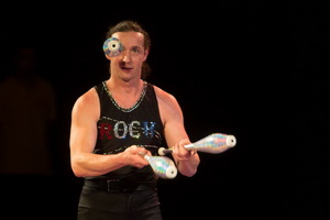 Benjamin Pfeiffer aus Berlin jongliert mit weißen kleinen Bällen und Keulen. Eine umfangreiche verschiedenster Routinen beherrscht der sympathische Artist in erstklassiger Ausführung. Sicher und routiniert werden die Muster ausgeführt. Als effektvollen Höhepunkt jongliert er im abgedunkelten Zelt mit fünf beleuchteten Keulen.