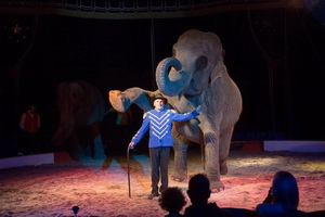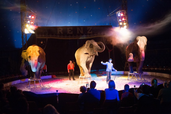 Direktor Fanz Renz und seine drei großen indischen Elefanten bilden vor der Pause ein Highlight des Programms. Ruhig und souverän leitet der Dompteur die mächtigen Dickhäuter zu ihren zahlreichen Tricks. Laufarbeit und Aktionen auf den Tonneaus werden mit Hochsitzern in abwechslungsreicher Weise kombiniert.