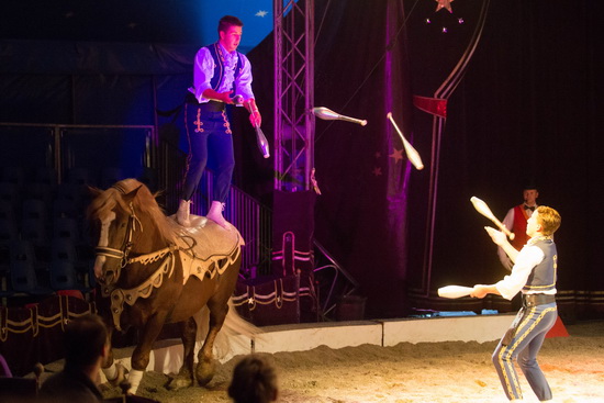 Anthony und Bernardo Renz sind in einem weiteren Auftritt gemeinsam zu erleben. Mit einer temperamentvollen Jockeyreiterei gestalten die Brüder den ersten Teil der Darbietung. Anschließend glänzt Anthony als Jongleur zu Pferd. Sicher werden die Routinen mit Keulen ausgeführt. Pasings vom kanternden Pferd aus zum Partner in der Manege geben der Darbietung den besonderen Drive.