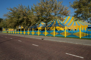 Das hohe Chapiteau bildet den Mittelpunkt des Circus und trägt auf den Mastspitzen dekorative Lichtelemente und ein Vorzelt im gleichen Dekor komplettiert das Arrangement.