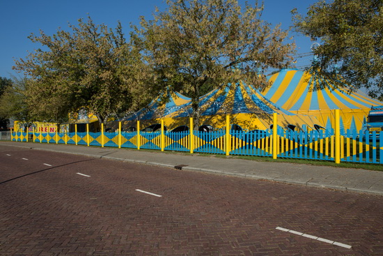 Auf einer Rasenfläche in einem parkähnlichen Gelände glänzte das gepflegte Material des großen Circus im strahlenden Sonnenlicht und die leuchtenden Hausfarben - gelb und blau - bilden einen lebhaften Kontrast zu den herbstlichen Tönen der umgebenden Natur.