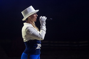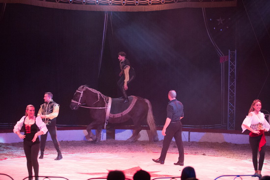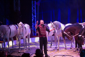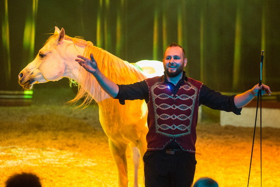 In einer „orientalischen Phantasie“ vereint Anthony Renz zwei Kamele mit zwei weißen Araberhengsten. Schließlich ergänzen zwei prächtige Watussi-Rinder die Formation. Die versiert und schwungvoll ablaufende Dressurfolge wird von Kimberly Scholl mit stimmungsvollem Life-Gesang wirkungsvoll untermalt.