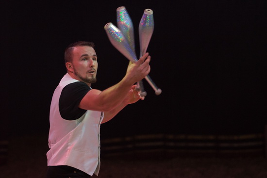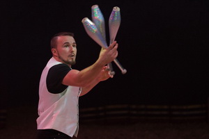Bernardo Renz tritt als versierter Tempojongleur in den roten Ring. Mit fünf Tennisbällen erfolgen die ersten Touren, dann steigert er auf sechs Bälle. Im zweiten Teil der Darbietung erfolgen die abwechslungsreichen Routinen mit silbernen Keulen. Versiert und sicher werden die Requisiten gehandhabt.