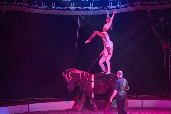 Vor der Pause reiten Anthony Renz und seine Partnerin Kimberly Scholl ein mitreißendes „Pas de deux“. Auf einem mächtigen Kaltblut-Gespann bieten die beiden Artisten zu Irish-Folk Melodien eine Vielzahl erstklassiger und spektakulärer Tricks.