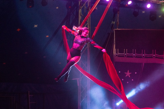 Höchst temperamentvoll arbeitet die sympathische junge Frau im zweiten Teil der Show an den Tuchstrapaten. Tempo geladen erfolgen die kraftvoll ausgeführten Tricks und weite Flüge füllen die Kuppel. Eine Reihe riskanter Abfaller sorgt für den notwendigen Nervenkitzel.