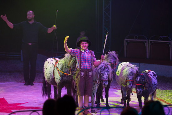 Die jüngsten Mitglieder der Circus-Familie, Alexandro und Antonio, sind gleichfalls in der Manege präsent. Zunächst werden fünf Laufenten zu ihren Figuren angeleitet, dann folgen muntere Tigerschek-Ponys den Anweisungen der jugendlichen Vorführer.