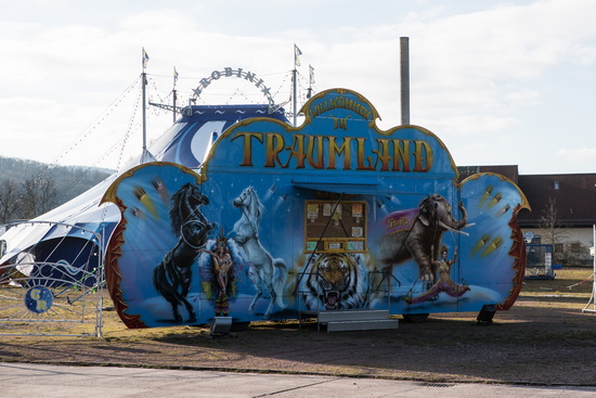 Der prächtige Fassadenwagen, er bietet auch dem Kassenschalter Raum, lädt zum Besuch des Circus ein. Die schwungvoll geschweifte Front ist kunstvoll mit großformatigen Circusmotiven dekoriert und trägt im oberen Bereich in goldfarbenen Lettern die Aufschrift „Willkommen im Traumland“. Ein dekorativer Zierzaun flankiert die Fassade zu beiden Seiten. In der Dunkelheit lassen zahlreiche Lichterketten an den Zelten sowie die Lichterbögen am Zaun den Circus hell erstrahlen.