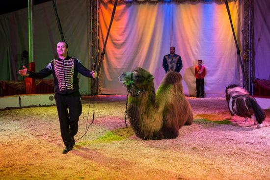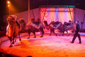 Vier mächtige Steppenkamele, die prächtige Schabracken tragen, erobern die Manege und werden von Albani Schmidt zu ihren abwechslungsreichen Lauffiguren angeleitet. Gegenläufe, Fächer und abliegen gehören zu den bereitwillig und erstklassig ausgeführten Elementen. Ein Pony läuft Achten um zwei Kamele, die ruhig auf Tonneaus verharren. Als Da Capo zeigt ein weiß-schwarzes longengängiges Lama hohe Barrierensprünge.