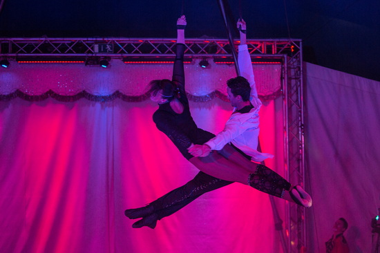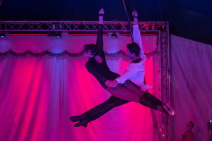 Einen veritablen Act an den Strapaten bietet Robin Schmidt jr. zusammen mit seiner Schwester Moischa. Kraftvoll ausgeführte Flüge füllen die Kuppel. In dem harmonischen Ablauf erfolgen die anspruchsvollen Tricks, die sowohl gemeinsam als auch solo gearbeitet werden, in erstklassiger Ausführung.