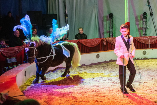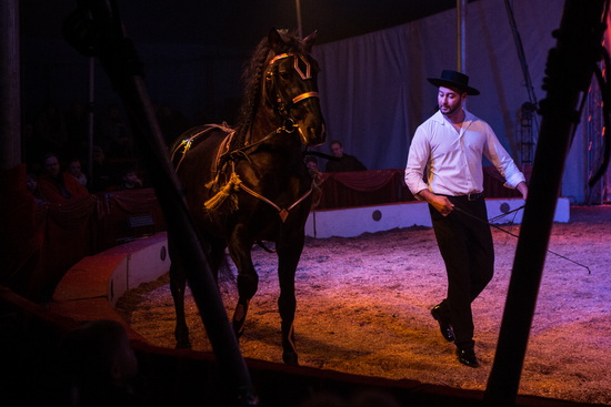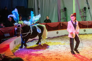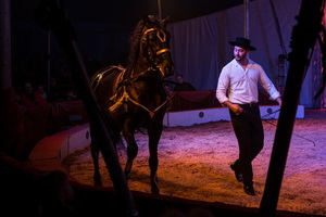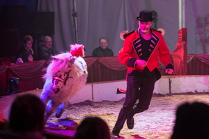 Einige weitere Darbietungen mit Tieren sind in der abwechslungsreichen Spielfolge zu erleben. Zunächst präsentiert Silvano Schmidt einen stolzen Andalusier-Hengst, mit prächtigem goldfarbenem Geschirr herausgeputzt, in einem eindrucksvollen Auftritt. Stolz absolviert das edle Ross sein Repertoire und umrundet die Manege im Spanischen Tritt.