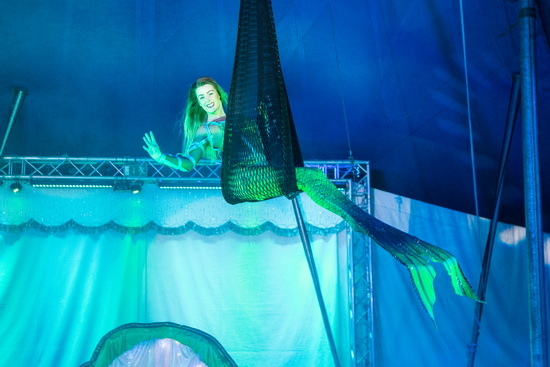 Eine riesige Muschel öffnet sich langsam und gibt den Blick auf eine Nixe – Monique Renz – frei. Mit diesem stimmungsvollen Einstieg gelingt der Einstieg in die Luft-Darbietung am Netz der charmanten Artistin perfekt. Die vielseitige attraktive Trickfolge wird gekonnt geboten. Mit eleganten und harmonischen Übergängen verbinden sich die einzelnen Tricks zu einem geschmeidigen Ablauf. Mit der grün-blauen Ausleuchtung des Zeltes und einer „Luftblasenprojektion“ auf dem weißen Hintergrund wird das Unterwasser-Thema der Darbietung konsequent fortgeführt.