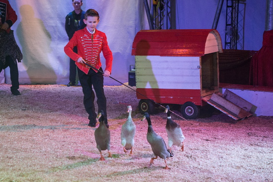 Nachwuchs-Tierlehrer Teggiano Schmidt hat zwei Auftritte im aktuellen Programm. Zunächst folgen vier Laufenten seinen Anweisungen. Sie hüpfen über flache Hürden und überwinden eine Rutschbahn. Später präsentiert er ein schwarzes Pony, dessen erlerntes Können im tiefen durchstecken des Kopfes zwischen den Vorderhufen gipfelt.